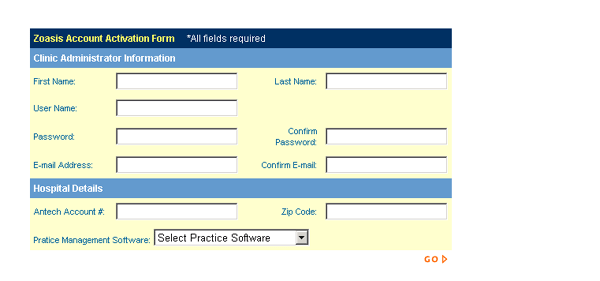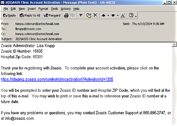 You can select a User Name and Password that will grant you access to your hospital’s data. The User Name and Passwords must be between 3 and 20 alpha-numeric characters (no spaces, symbols, or punctuation). Also, these fields are case sensitive – the way that you enter them in registration is exactly the way you will need to enter them each time you log into the Zoasis website. You must know your Antech Account number and ZIP code in order to complete the registration. If these two numbers do not match each other, and match the data on file from Antech, your registration will not be completed. If you encounter this error, you should contact your Antech account manager for assistance. Once you have completed the registration form, click GO. If all data fields are valid, an e-mail will be sent to the address that you provided. This e-mail will contain a link that you must click in order to complete the registration process. Your registration will only be completed if you click on this link – therefore, you must provide an address at an e-mail account to which you have access. A sample e-mail appears below. |